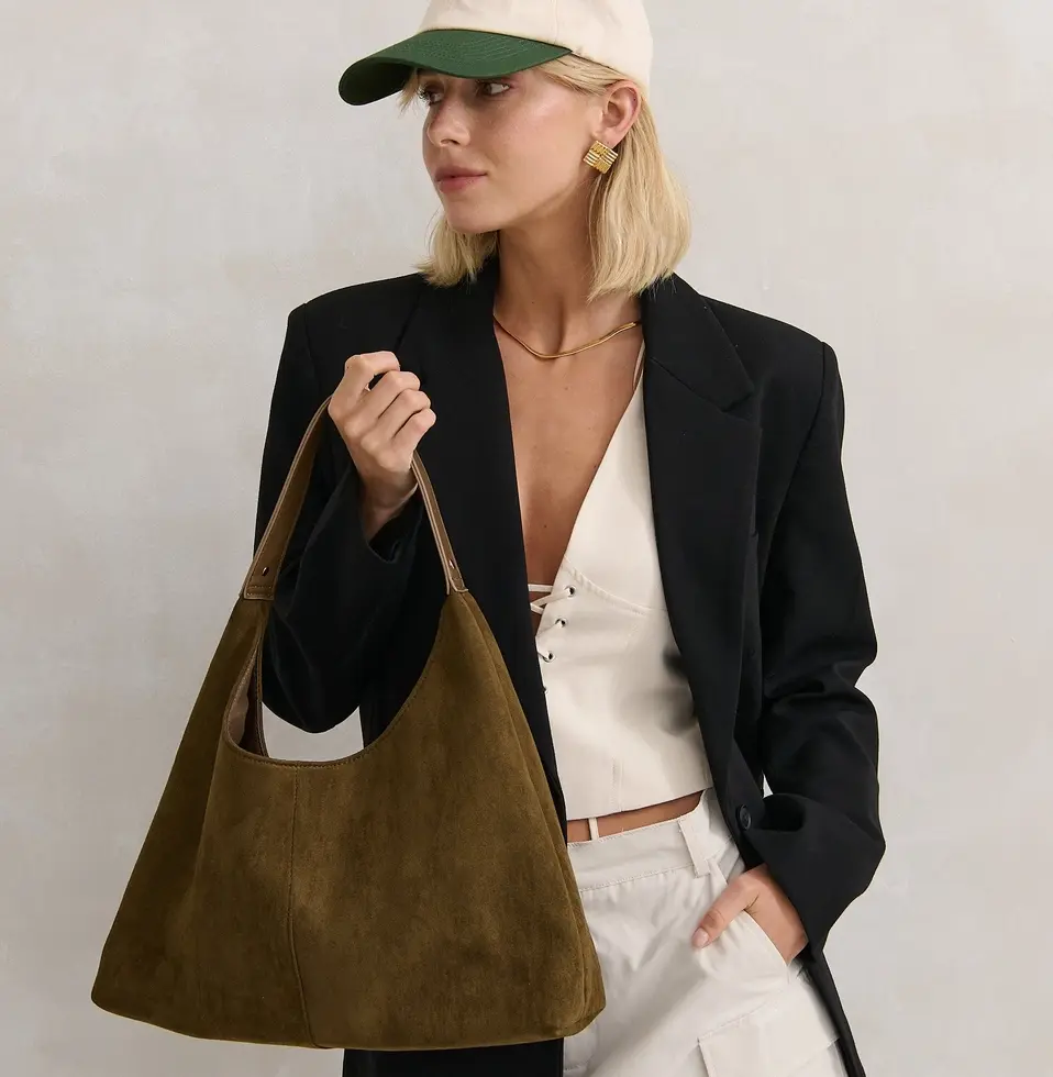Sac en daim végétalien doux, avec poignée en cuir végétalien. Comprend une poche intérieure zippée et un intérieur entièrement doublé.